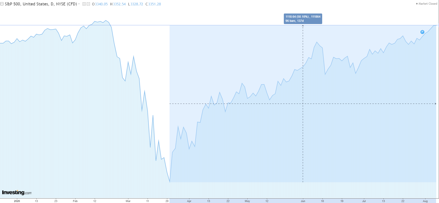 밑의 그림에서 볼 수 있듯이, 지난 6개월동안 COVID-19로 인한 영향으로 S&P500이 고점대비 3월 23일까지 약 -35%까지 하락했었고 (MDD : -35%), 그 이후 8월 7일 기준으로 +50%까지 회복되었다.