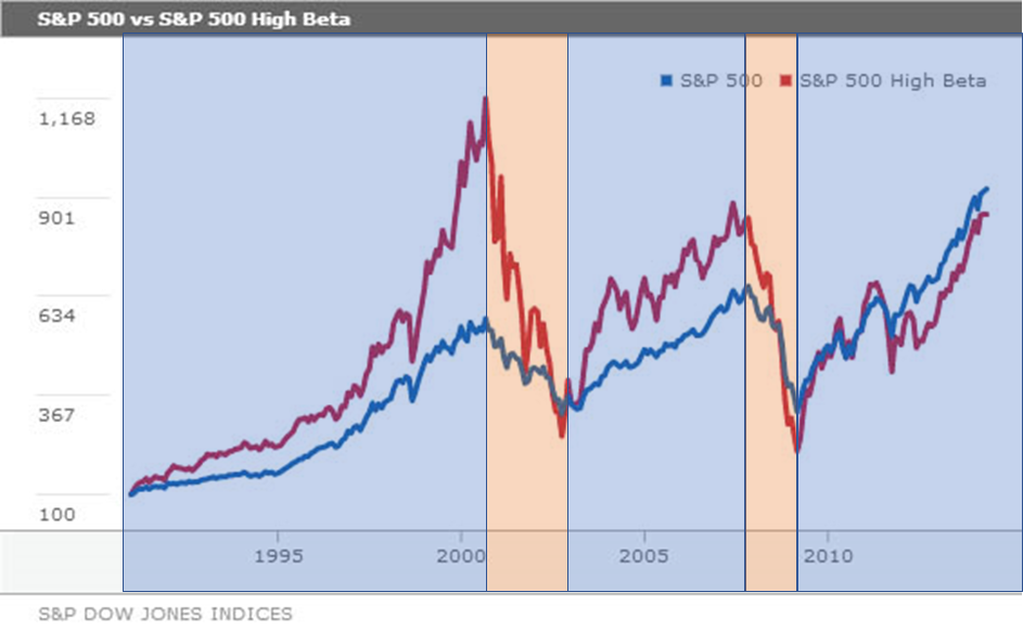 위 그래프는 파란선 S&P500 지수와, S&P500 기업들 중에서 베타상위 100개 주식을 모아놓은 빨간선 ETF (SPHB)의 performance를 비교한 그래프이다. (1990~2014)