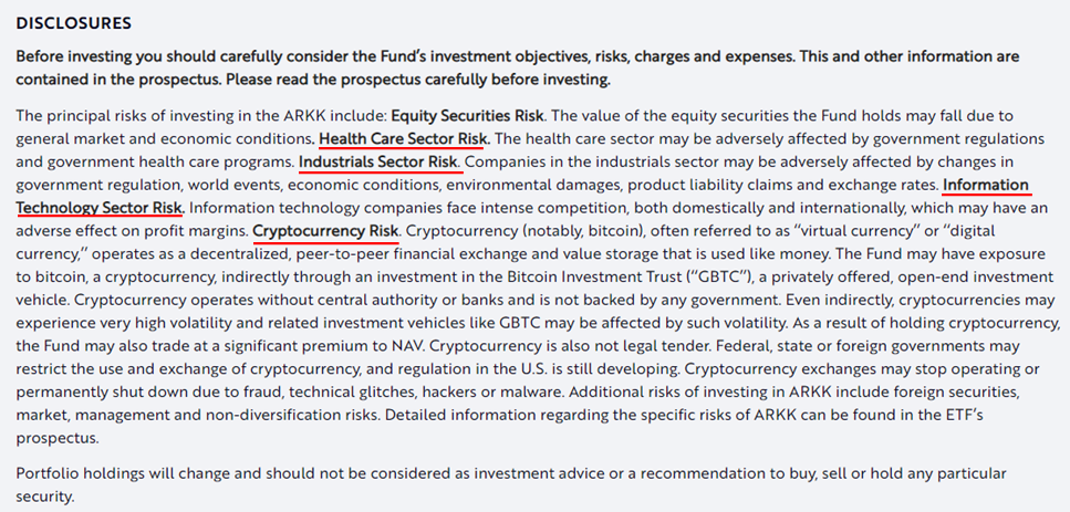 이어서, 주의사항을 살펴보면, Equity Securities Risk (주식 고유의 리스크), Health Care Sector Risk (헬스케어 섹터 리스크), Information Technology Sector Risk (IT섹터 리스크), Cryptocurrency Risk (암호화폐 리스크) 등이 자신의 투자자산의 리스크가 될 수 있다고 말하고 있다.