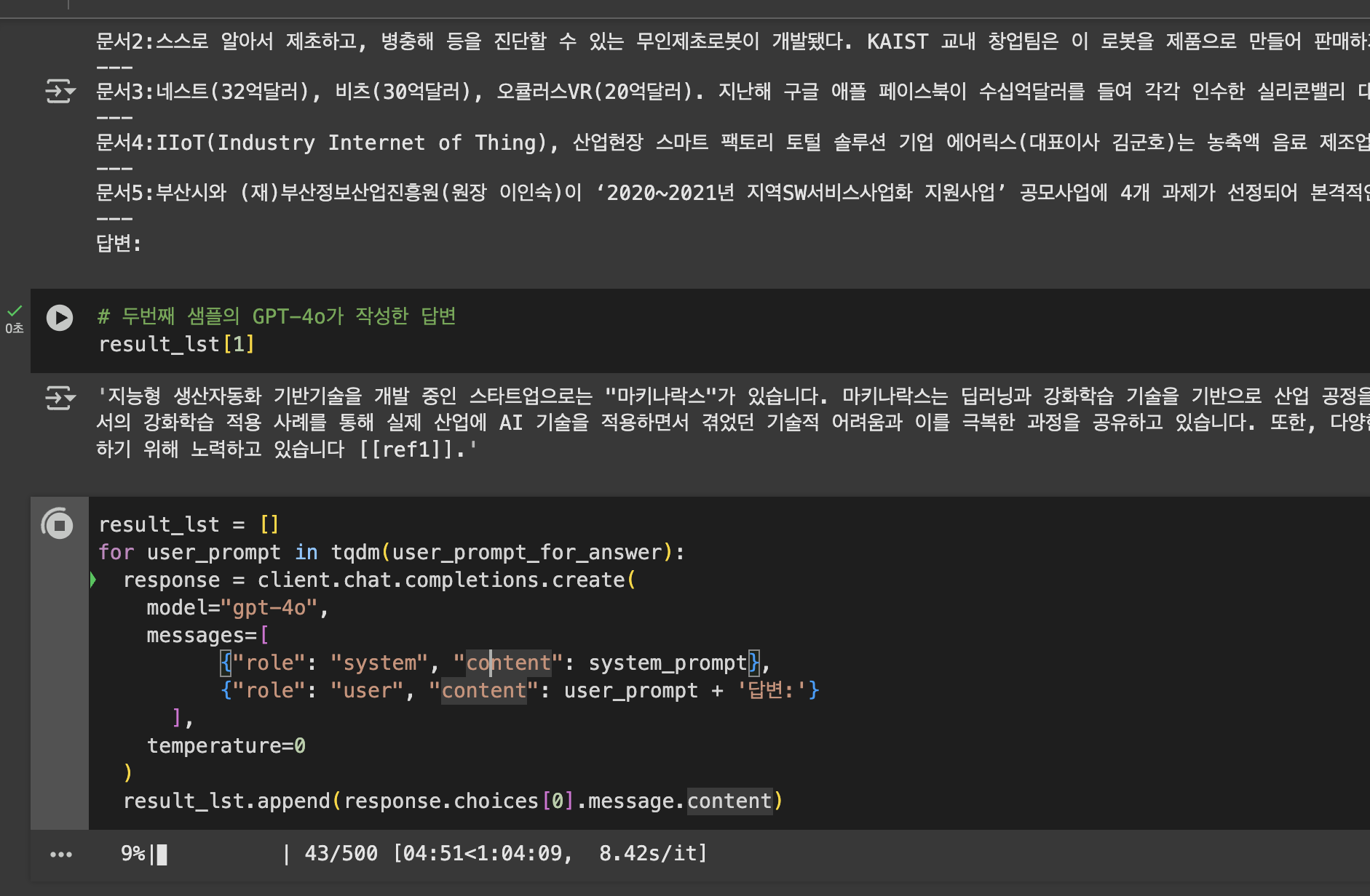result_lst = [] for user_prompt in tqdm(user_prompt_for_answer): response = client.chat.completions.create( model="gpt-4o", messages=[ {"role": "system", "content": system_prompt}, {"role": "user", "content": user_prompt + '답변:'} ], temperature=0 ) result_lst.append(response.choices[0].message.content)